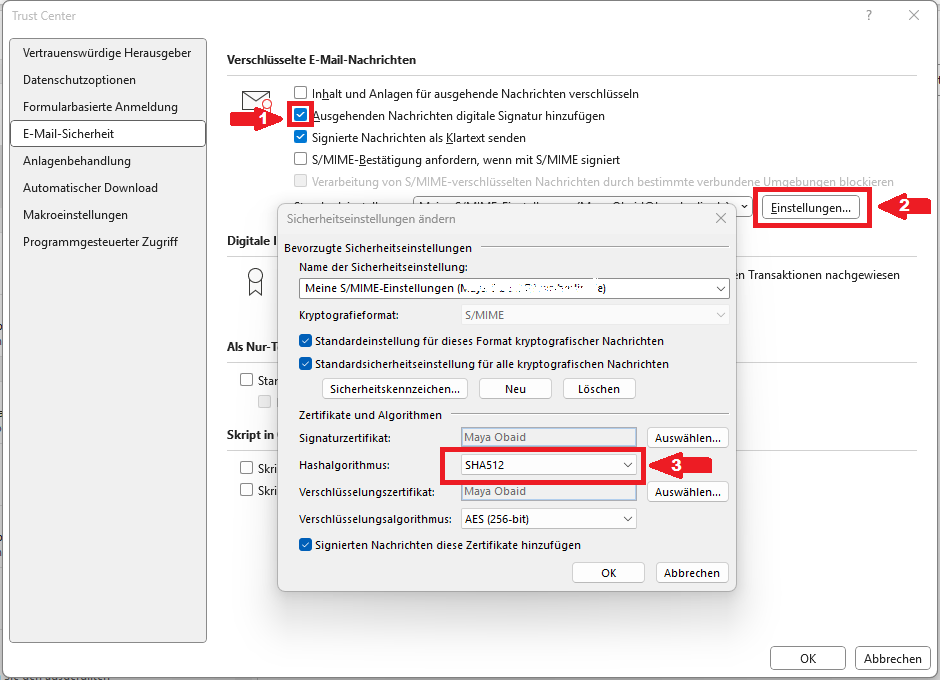 Select the checkbox “Add digital signature to outgoing messages” and change the hash algorithm to SHA512 in the settings.