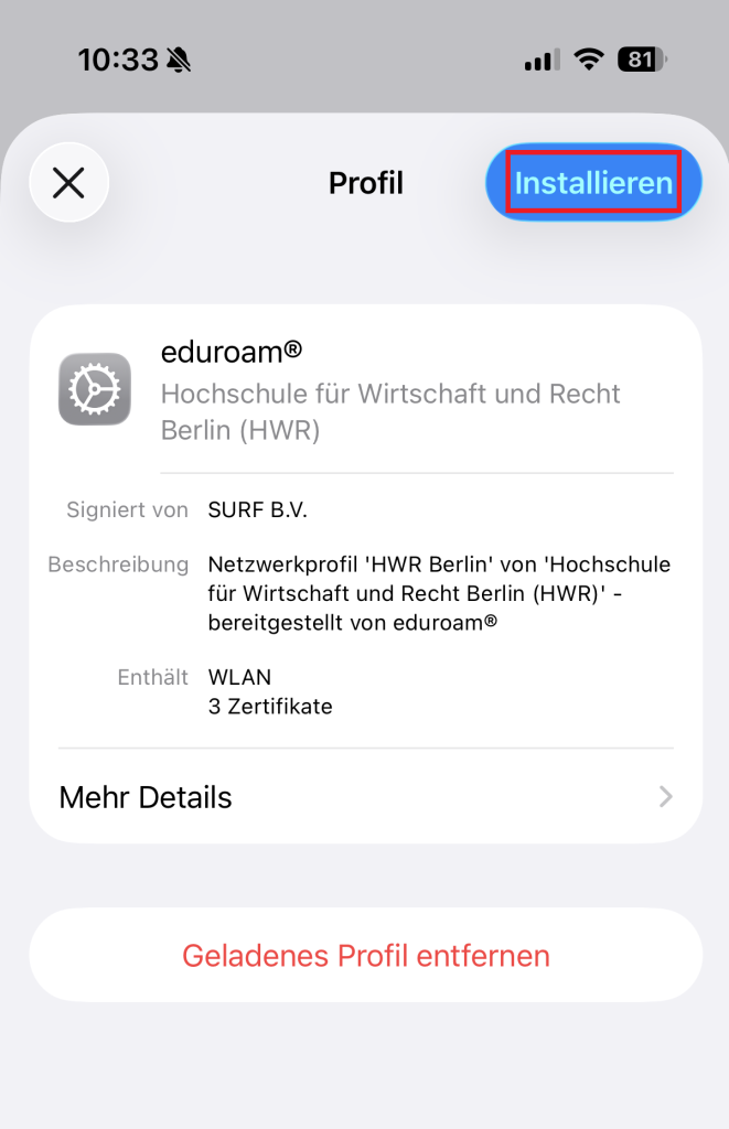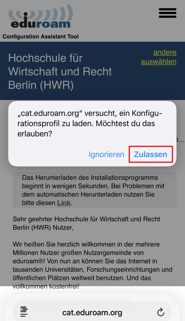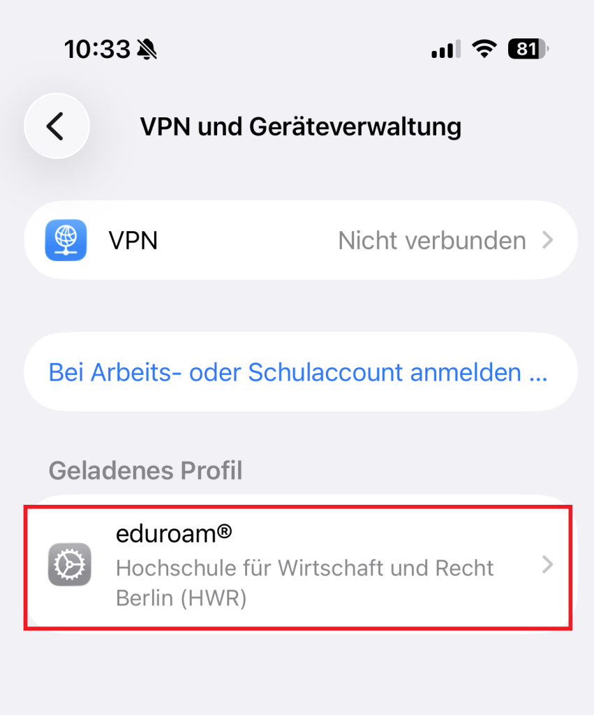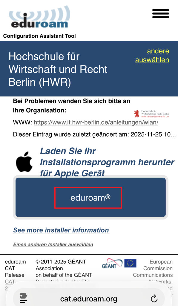 The Wi-Fi connection at HWR Berlin is provided via the Education Roaming (eduroam) service of the Deutsches Forschungs Netz (DFN). To install eduroam on your iPhone or iPad, your login details must be linked to the certificate.