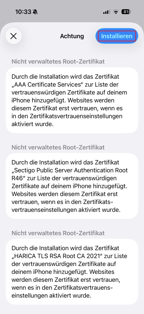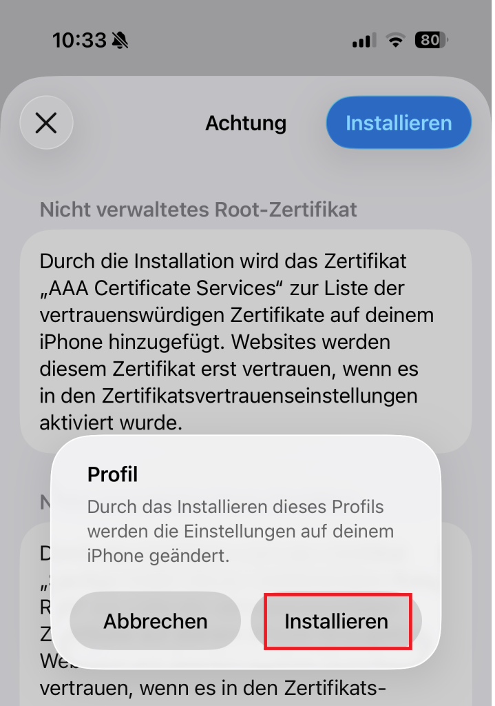 Confirm the installation of the certificate by entering your PIN or using your fingerprint.