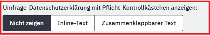 - Nicht zeigen: Ist angeboten, jedoch nur dann zu empfehlen, wenn an anderer Stelle (z.B. in der Willkommensnachricht) über die Verwendung und Verarbeitung der erhobenen Daten informiert wird. In diesem Fall können die Umfrageteilnehmenden ohne explizites Anklicken zur Bestätigung der DS-Richtlinie an der Befragung teilnehmen. In den beiden anderen Fällen muss jeweils erst die Checkbox angeklickt werden, bevor man mit weiter die Umfrage starten kann.