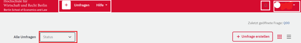 Unter Hilfe finden Sie Informationen zur Nutzung. Rechts oben können Sie durch Klick auf Ihren Benutzer*innennamen Ihr Profil aufrufen, die Anzeigesprache ändern oder sich abmelden. Das Glockensymbol informiert Sie über aktuelle Hinweise. Liegen keine Hinweise vor, ist es ausgegraut wie im obigen Bsp. Unter Status können Sie sich Ihre erstellten Umfragen nach Status anzeigen lassen.