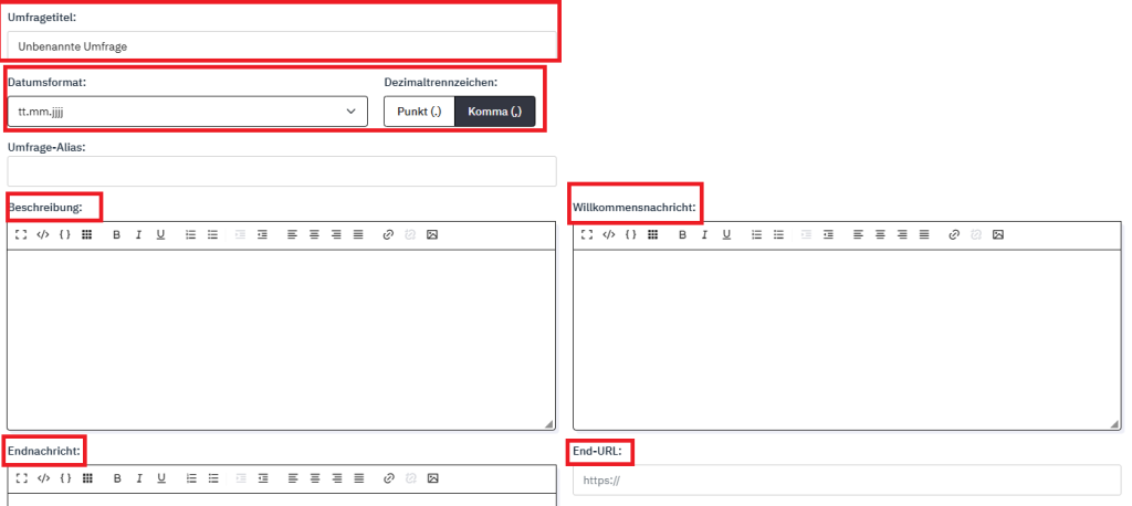 - Endnachricht: Die Nachricht in diesem Textfeld sehen die Teilnehmenden nach Abschluss der Umfrage. Hier können Sie sich z.B. für deren Mitwirkung bedanken oder Hinweise zum Verlauf des Forschungsprojektes hinterlegen.