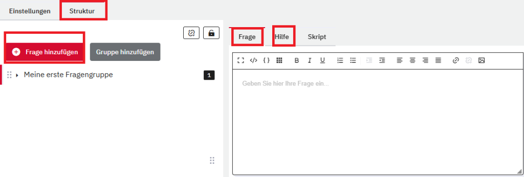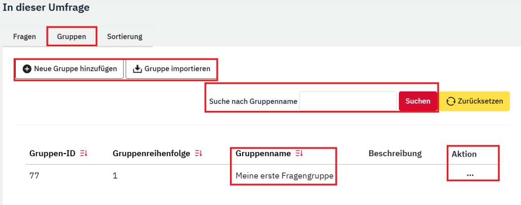 - Neue Gruppe hinzufügen: Anlegen einer weiteren Fragengruppe.