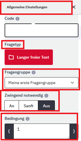 - Code: Jede Frage muss mit einem Code versehen werden, dieser dient als ID der Frage z.B. beim Export in ein Auswertungsprogramm wie SPSS. Er ist eine Pflichtangabe und muss mit einem Buchstaben beginnen. Es sind nur Zahlen und Buchstaben für Codenamen zugelassen.