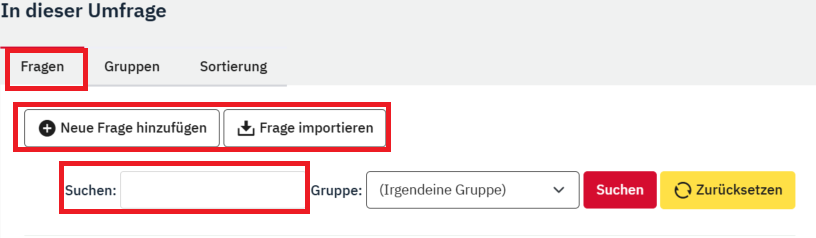 - Suchen: Suchen nach einer Fragengruppe (bei umfangreichen Umfragen hilfreich).