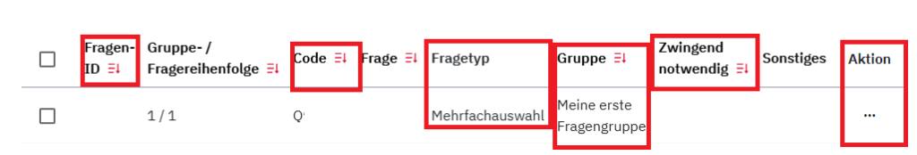 Die Übersicht bietet Ihnen auf einen Blick zentrale Informationen zu einzelnen Fragen Ihrer Umfrage, so z.B. der Code der Frage, der Fragetyp und die dazugehörige Fragengruppe. Auch lässt sich erkennen, ob Fragen zwingend notwendig sind.