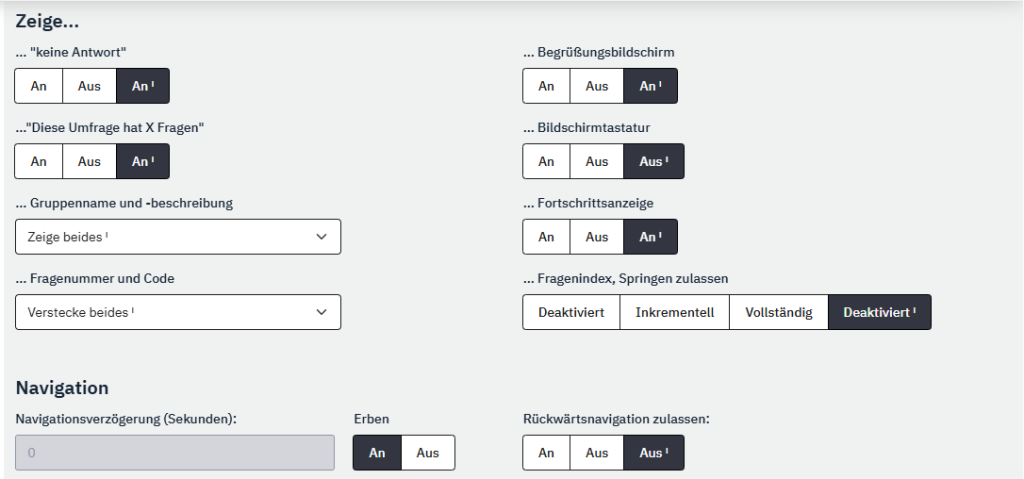 - Unter Präsentation können Sie Einstellungen vornehmen, die beeinflussen, wie Ihre Umfrage später für die Teilnehmenden angezeigt wird.