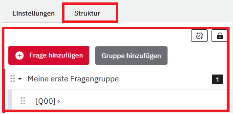 Neben der Ansicht Einstellungen können Sie im Editor auch die Struktur-Ansicht auswählen. Diese Ansicht bietet weniger, als Sie unter Einstellungen finden können. Sie ist daher hilfreich, wenn Sie an Fragen oder Fragengruppen arbeiten wollen.