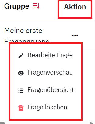 Pro Zeile finden sich für jede Frage vier Funktionen, die über die drei Punkte unter Aktion ausgewählt werden können: