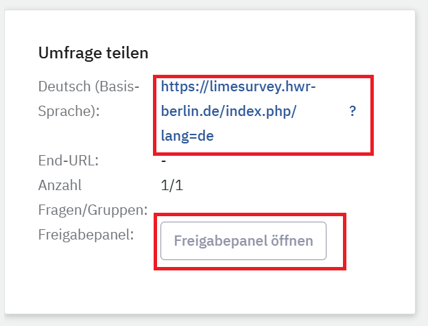 - Umfrage teilen: Automatisch angelegter Link zur Umfrage. Der Link, der auch an die Teilnehmenden der Umfrage versendet werden kann.