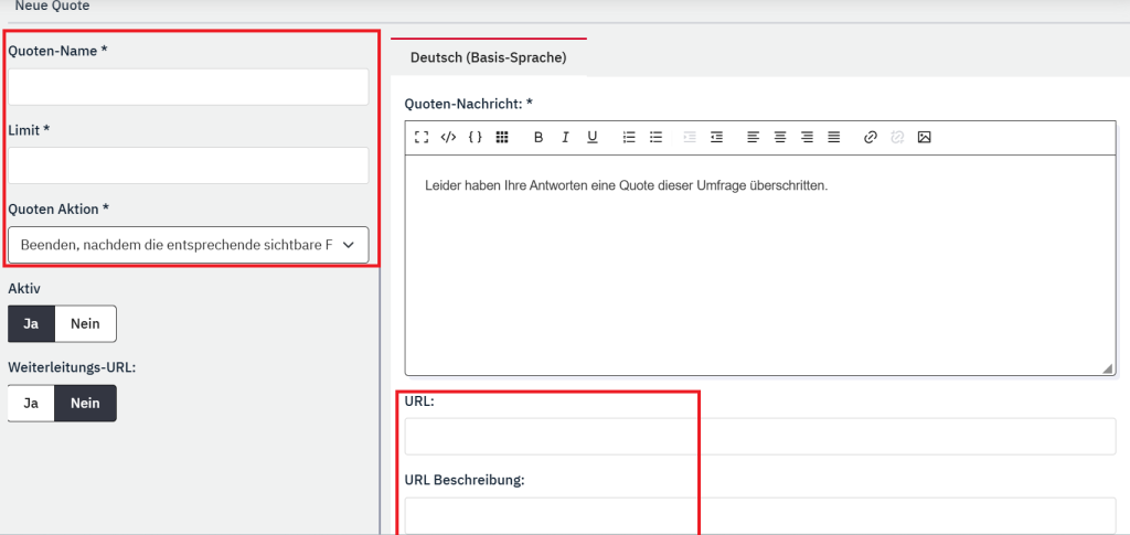 Es kann für bestimmte Forschungsfragen sinnvoll sein, eine bestimmte Zusammenstellung der Stichprobe sicherzustellen. Über die Funktion Umfrage-Quoten lässt sich dies in Limesurvey umsetzen. Standardmäßig werden keine Quoten festgelegt.