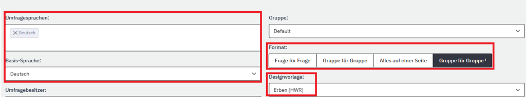 - Sprache: Als Basis-Sprache ist Deutsch voreingestellt und nicht veränderbar. Unter Umfragesprachen können Sie weitere auswählen, wenn Sie Ihre Umfrage z.B. auf Englisch anbieten wollen.