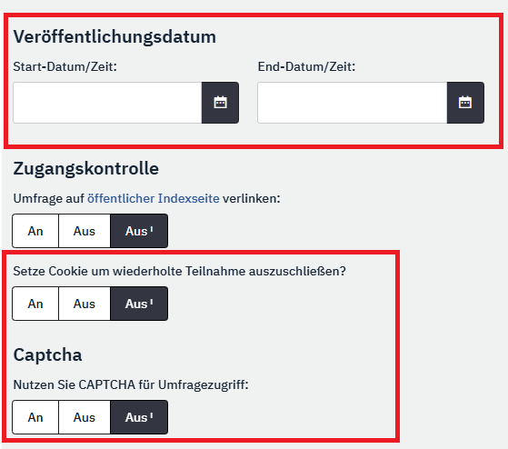 - Veröffentlichkeitsdatum: An dieser Stelle legen Sie fest, in welchem Zeitraum Ihre Umfrage für Teilnehmende verfügbar ist. Selbst wenn Teilnehmende den Link zu Ihrer Umfrage bereits vorher kennen, können Sie die Umfrage erst nach dem Startdatum ausfüllen. Das Startdatum ersetzt nicht die Aktivierung der Umfrage. Sie können eine Umfrage aktivieren und ein Startdatum inkl. Uhrzeit festlegen, das in der Zukunft liegt. Das Setzen eines Enddatum ist besonders wichtig, da sie eine aktivierte Umfrage nicht wieder deaktivieren können. Setzen Sie hier auf jeden Fall ein Datum, um zu bestimmen, ab wann Ihre Umfrage Teilnehmenden nicht mehr zur Verfügung steht.