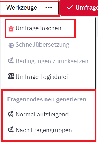 - Umfrage löschen: löscht komplette Umfrage inkl. der Frage- und Antwortdaten. Hier ist Vorsicht angeraten.
